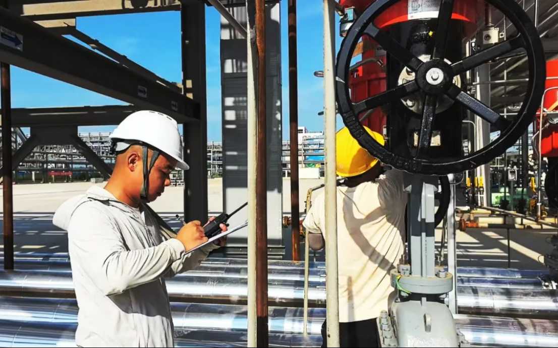 阳光炙烤下,他的皮肤愈发黑亮,对讲机里传出的声音也有些沙哑。他却不以为意,还打趣道:“现在是冲刺投运的关键时期,我的皮肤每多黑一分,罐区离投产就更近了一步!”