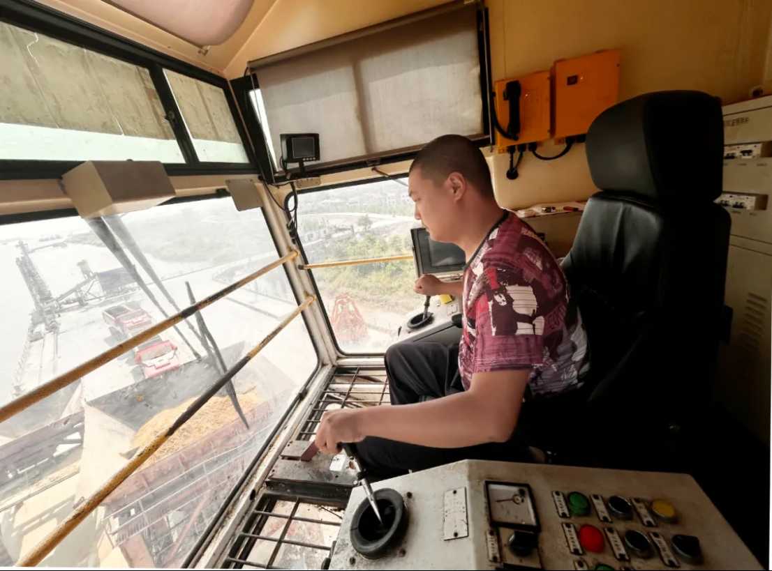 狭小的吊车操作室经过暴晒,就像一个桑拿间。司机易文祥端坐其中,汗珠从额头滚落,衣服早已湿透,他却无暇顾及,全神贯注地操作控制杆,紧盯着下方的船舱和抓斗,将一斗斗黄沙快速吊运至接料漏斗内,每一个动作都干脆利落。