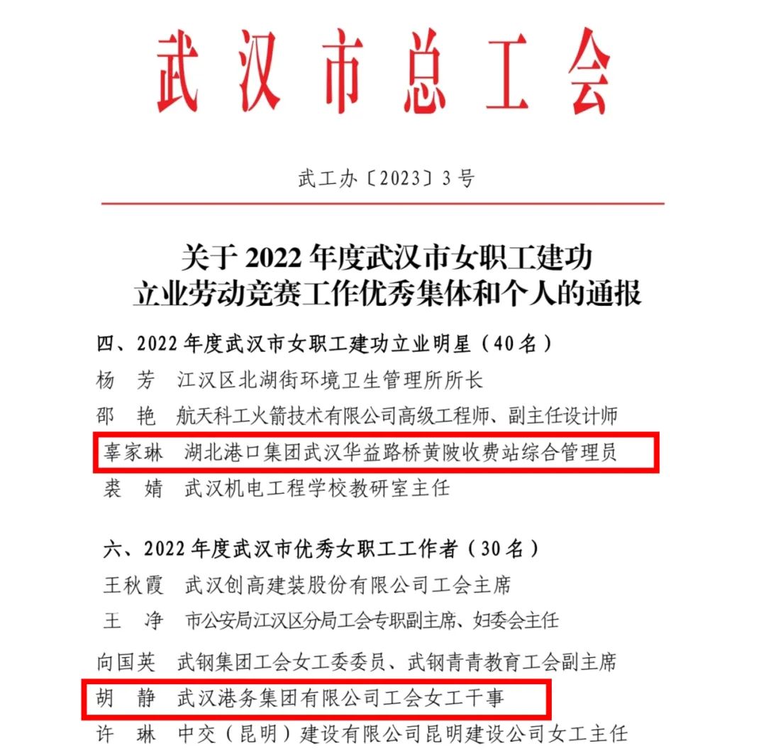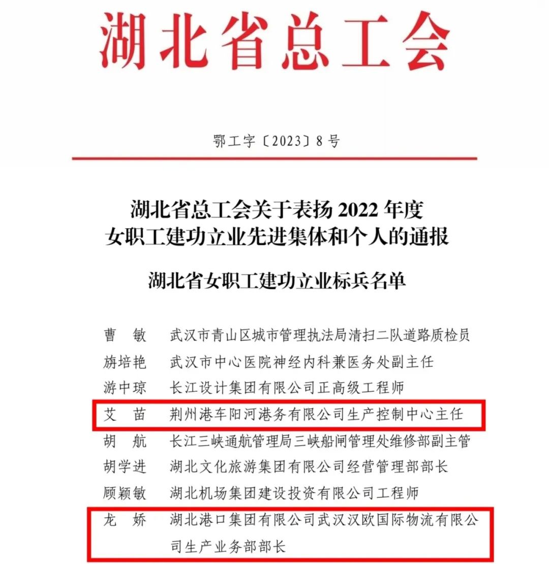 在第113个“三八”国际妇女节到来之际,省市总工会分别发文,对2022年度省市女职工建功立业先进集体和个人进行表彰,湖北港口集团有限公司有4名女职工分获殊荣。