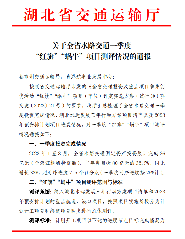 日前,湖北省交通运输厅评选的全省水路交通一季度“红旗”“蜗牛”项目测评情况名单出炉,宜昌港务集团宜都港区枝城作业区铁水联运码头一期工程榜上有名,荣获争先创优“红旗”项目,这是继获得全省公路水运工程“平安工地”建设示范工程之后,又一次获得省级殊荣。