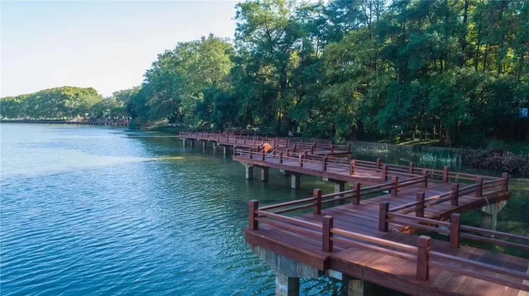 绵延近5公里的木栈道,呼应世界级的东湖绿道,沿湖绕水而行,移步换景,东湖、珞珈山、磨山美景尽收眼底。