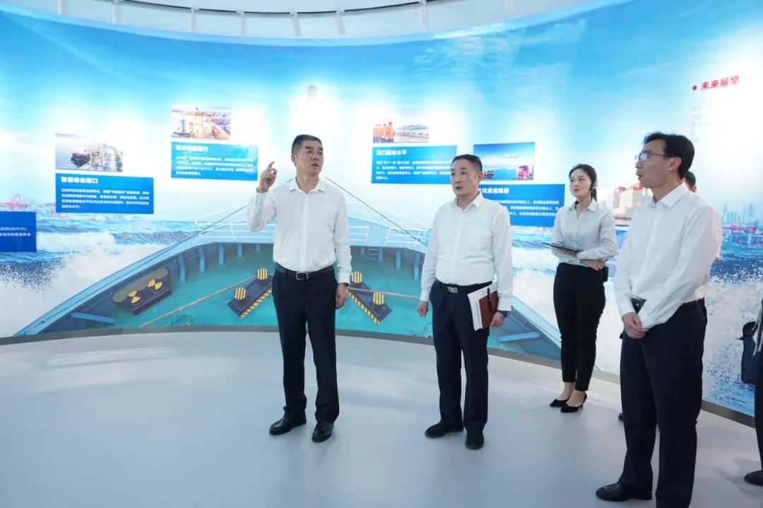 付明贵一行在阳逻港十周年展厅,重温习总书记的殷殷嘱托,并实地考察了码头前沿、中控室、智能远控室及电动集卡换电站,听取了港区生产运营及绿色智慧港口建设情况汇报。