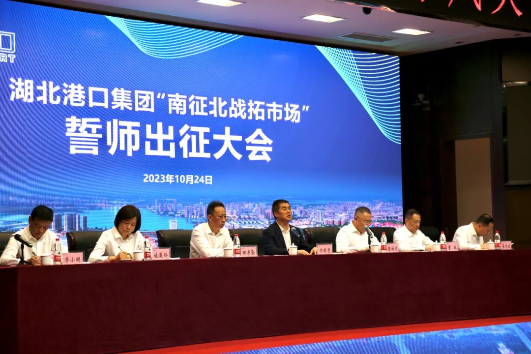 10月24日,湖北港口集团召开“南征北战拓市场”誓师出征大会,集团公司党委书记、董事长付明贵作动员讲话,并向7个团队授旗,首批近百名业务员在壮行的鼓声中登车,奔赴19个省份拓展业务。