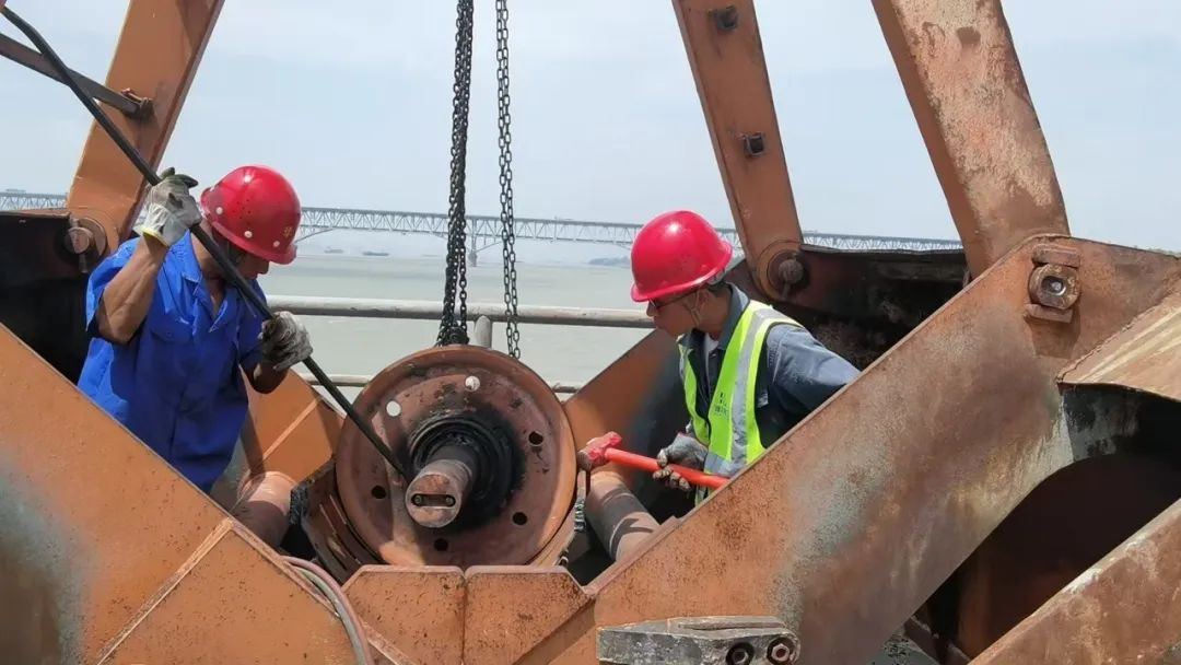 在小池滨江码头平台上,职工崔坤、李松正在进行料斗维修作业。近40℃的高温下,金属构件被烈日炙烤得滚烫,两人配合默契:一人精准定位故障点,一人抡起铁锤用力敲打,每一个动作都干脆利落。