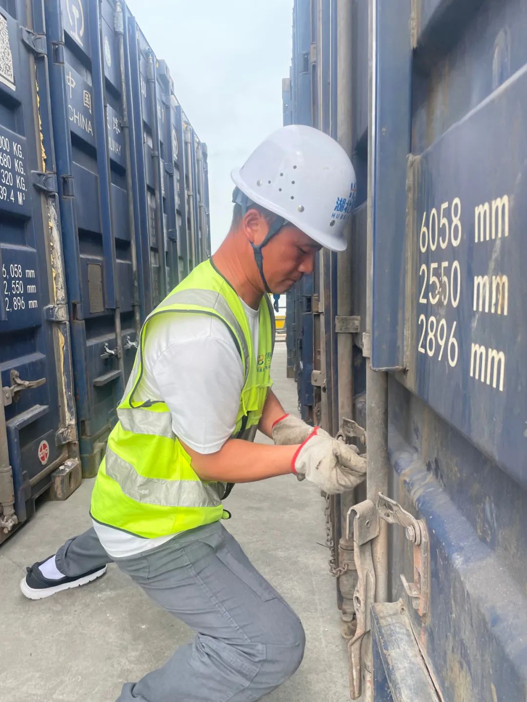 唐家渡港区临港新城综合码头,地表温度超40℃。为满足“散改集”客户的时效要求,黄冈港发物流有限公司生产管理员王信正在认真检查集装箱箱门是否封闭严实,确保每一个细节都符合作业标准。