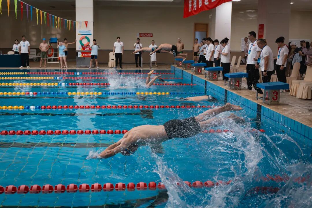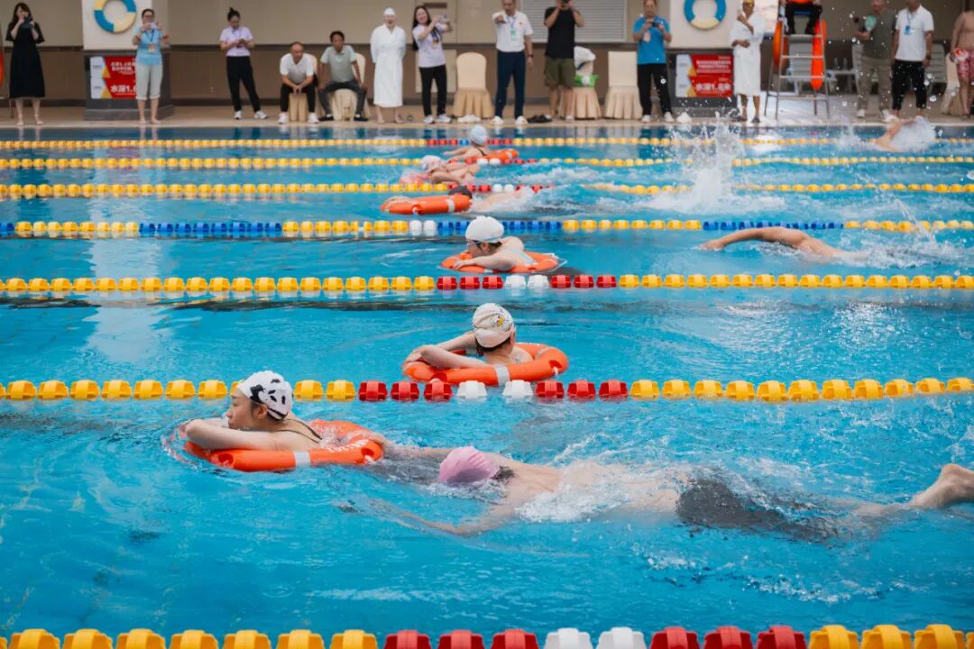 随着发令枪“砰”的一声响起,泳池边的气氛瞬间被点燃。选手们如离弦之箭跃入泳池,水花四溅,划臂、转身、冲刺……一套动作行云流水,每一个细节都展现出良好的竞技状态和过硬的专业技能。在青年组女子50米蛙泳赛场,余恺平全程保持稳定节奏,手臂划水强劲有力,腿部蹬夹连贯流畅,面对劲敌始终紧咬比分,每一次换气都精准把控时机,最终摘得亚军。而青年组男子100米蛙泳项目中,黄明昊展现出持久的耐力和出色的爆发力,前半程紧跟领先选手调整节奏,后半程果断开启冲刺模式,突然加快了划水频率,整个人仿佛化身为一道闪电,直逼终点,成功拿下第二名。两人还携手出战50米救生项目,从入水施救到托举前进,动作衔接默契,安全救援技能得到充分展示,最终取得了第四名的好成绩。