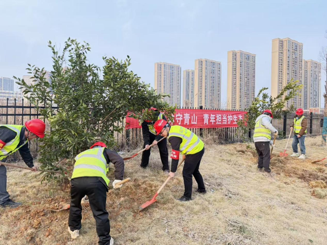 中欧班列多式联运中转中心配套道路电厂北路工程总承包项目现场,青年党员带头攻坚,一线员工主动参与,挥锹铲土、引水浇灌,细心呵护每一株绿植,用行动践行“路桥先锋筑彩虹”的责任使命。