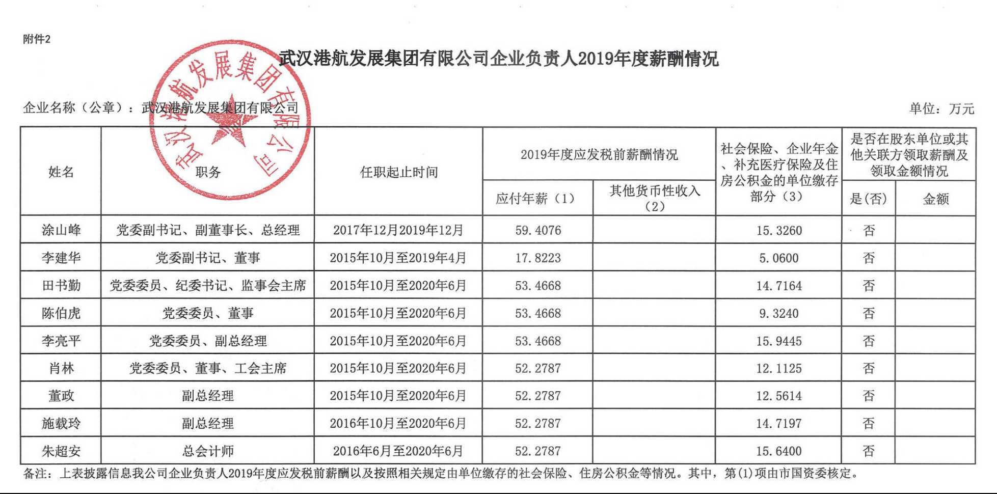 根据市人社局和市国资委通知要求,现将武汉港航发展集团有限公司2019年度企业负责人年薪及工资总额公示如下: